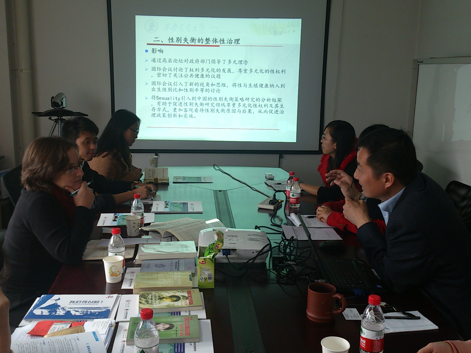 访问期间,李树茁教授首先感谢福特基金会二十多年以来对西安交通大学人口与发展研究所的大力支持,向她介绍了在福特基金会资助下,人口所完成的相关项目,取得的学术、政策研究成果以及获得的社会影响。并以“关爱女孩行动”为例,介绍了人口与发展研究所从问题出发,将全球视野与本国实际结合,对社会问题采取跨学科理论研究,然后在试验区试验,最终上升为国家政策的研究实践过程。博士生尚子娟对人口所在性别失衡治理领域的实践中总结出来的学术范式和公共治理研究框架进行了详细介绍。张群林博士专题向高倩倩女士汇报了今年刚获得福特基金会资助的“Sexuality/健康视角下的中国性别失衡治理”项目进展情况和下一步工作计划,并就项目实施中取得的经验教训以及遇到的困难和挑战做了简要陈述。最后,高倩倩女士肯定了基金会与人口所之间多年的成功合作,认为人口所多年以来的工作成绩体现了福特基金会的价值理念,同时也指出现行项目在不同地域、宗教文化可能会面临挑战,并和与会代表就项目的深入开展以及其他一些国家/地区与性别相关的热点问题交换了意见。
