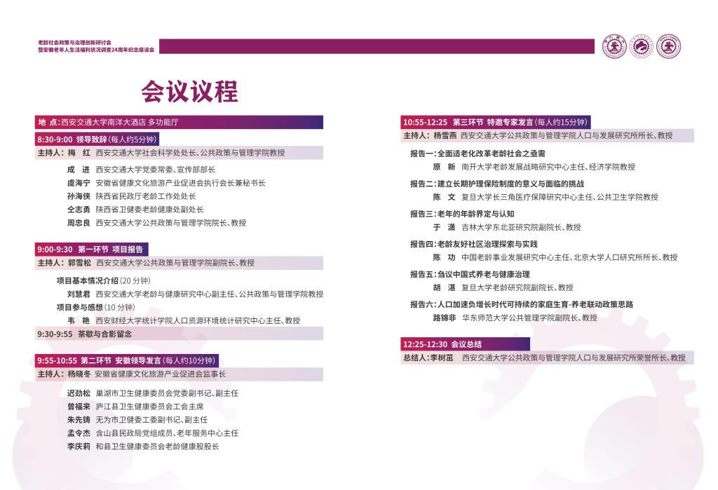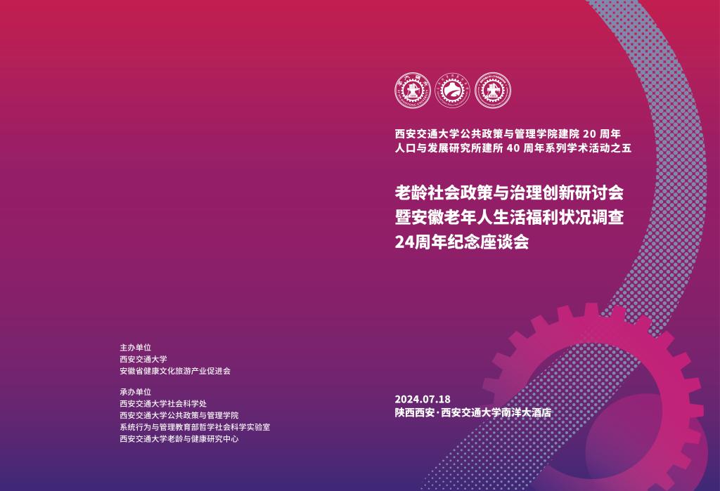 为庆祝西安交通大学公共政策与管理学院建院20周年、西安交通大学人口与发展研究所建所40周年,探讨我国在老龄社会治理领域存在的主要问题,推动该领域专家学者进行跨学科的学术交流与合作,为制定科学合理的老龄社会政策提供有价值的决策建议,由西安交通大学与安徽省健康文化旅游产业促进会主办,西安交通大学社会科学处、西安交通大学公共政策与管理学院、系统行为与管理教育部哲学社会科学实验室与西安交通大学老龄与健康研究中心承办“老龄社会政策与治理创新研讨会—暨安徽老年人生活福利状况调查24周年纪念座谈会”。