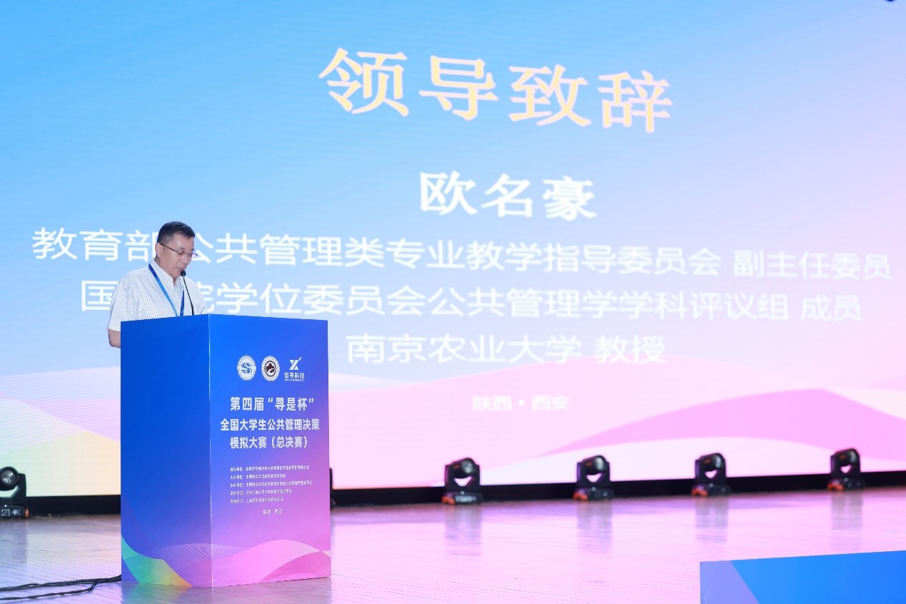 欧名豪代表教育部高等学校公共管理类专业教学指导委员会致辞。他对西安交通大学和上海哲寻信息科技有限公司对本次大赛的支持表示诚挚感谢。他指出,“寻是杯”全国大学生公共管理决策模拟大赛现已成为公共管理学科具有全国影响力的重要赛事。希望参赛选手通过比赛更系统地学习、运用专业知识,掌握更多公共管理理论与方法,不断提升能力素养。