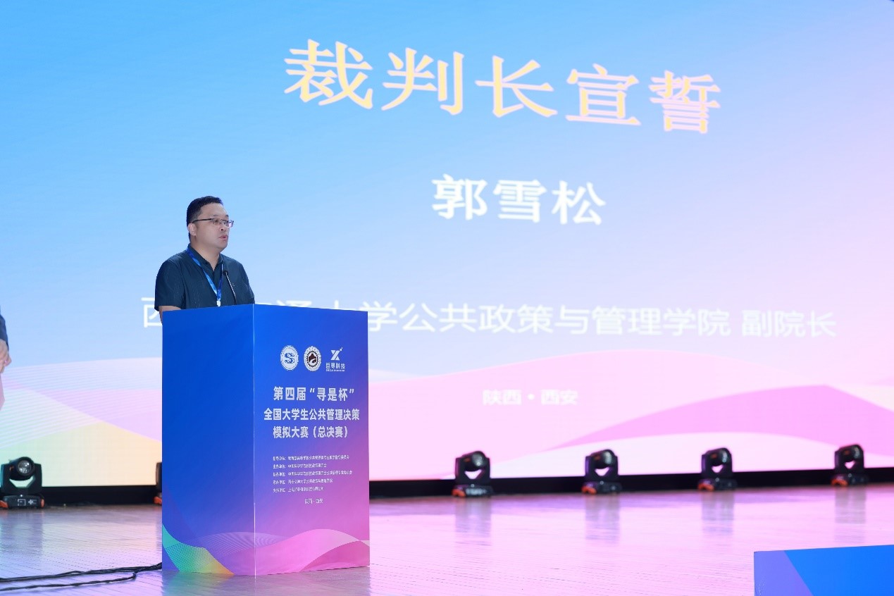 大赛裁判长、西安交通大学公共政策与管理学院副院长郭雪松宣誓表示,将严格遵守竞赛规则和裁判纪律,圆满完成裁判工作。西安交通大学公共政策与管理学院本科生胡玉菲作为参赛学生代表宣誓,表示将以积极、饱满、热情的态度参与比赛。