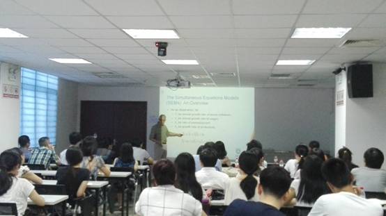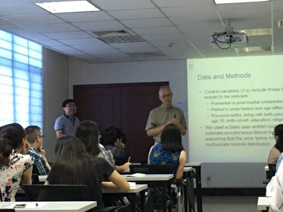 吴正教授做了题为“Conception and Cohabiting Union Dissolution: A Joint Model of Multiple Survival Processes”的专题演讲,在研究中吴正教授着重介绍了自己和合作者使用的多个存活过程的联立方程,使用加拿大GSS调查数据,研究了同居、生育、婚姻的关系。吴正教授严谨的研究态度和对方法的熟练应用,对于师生们进行科学研究具有重要借鉴意义。