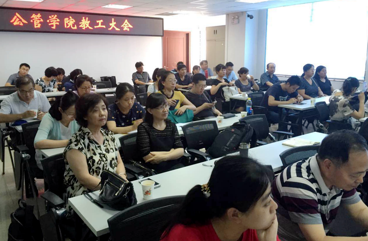 首先,周忠良副院长通报了学院的研究生教学工作,介绍了学院下学期的研究生推免工作计划,并从人才培养、科学研究、队伍建设、社会服务、体制机制等五个方面介绍了学院的“十三五”规划。董新宇副院长从本科教学及国际合作两个方面回顾了学院的相关工作并提出了公管学院在本科生院建设、基层学术组织建设等方面的工作计划。朱正威书记向全体教职员工传达了学校暑期工作会议精神,他指出,公管学院应当深刻理解学校的顶层设计与战略规划,直面问题,虽然形式上放假,但思想与行动不能放假,继续谋划、推动学院的新发展。接着,杜海峰院长进一步回顾了张迈曾书记、王树国校长等校领导与公管学院领导班子的谈话情况,他谈到,学校对公管学院的发展寄予厚望,学院要认识到挑战,强化指标意识,完善学科发展的顶层设计,深化学院管理的体制机制改革。他寄语学院教职员工,因为热爱学院,所以愿意直面挑战,希望大家继续支持学院的各项改革,支持学院新一届领导班子的工作,共同推动学院发展。最后,薛宇红副书记进行了学院暑期安全工作的相关部署。