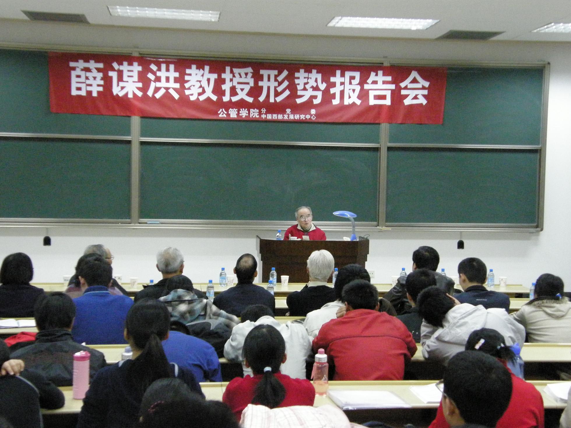 2007年12月7日下午,薛谋洪教授在主楼B-304为我院全体学生作了一场题为“世界格局的现状与前景”的形势报告会。会议由我院党委副书记薛宇红老师主持。
