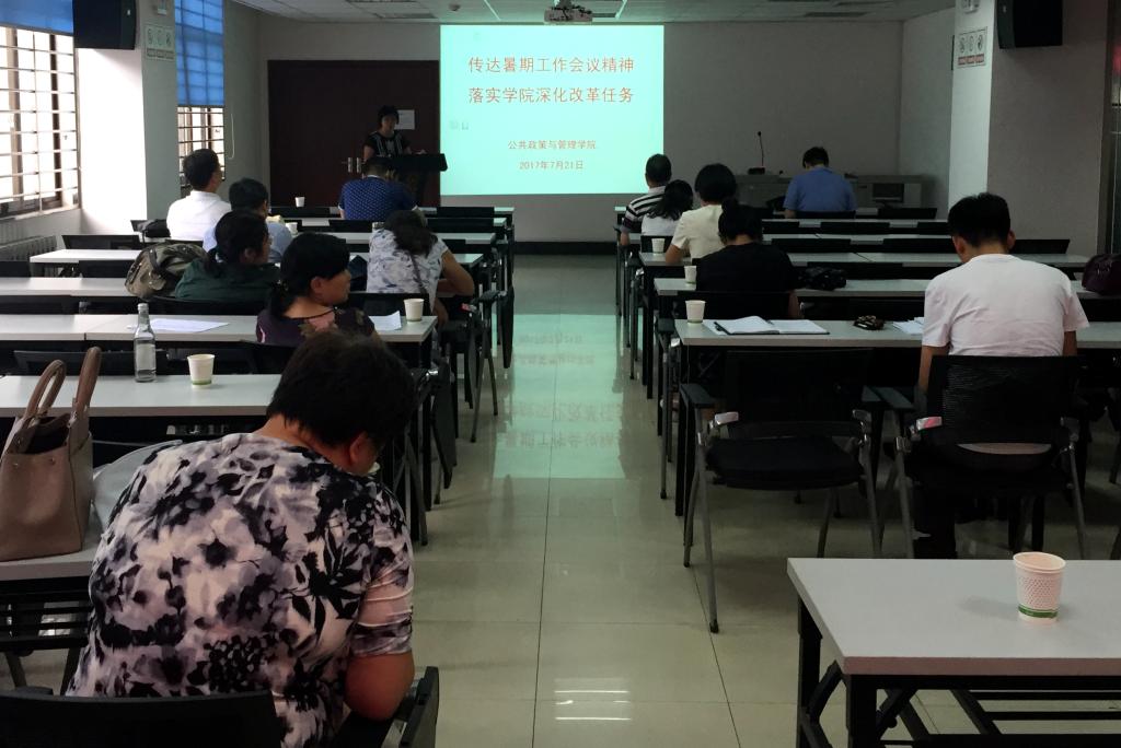 2017年7月20日下午、7月21日下午,公管学院分别召开党政联席会扩大会、全院教工大会,传达学校暑期工作会议会议精神,研讨、落实学院深化改革任务。