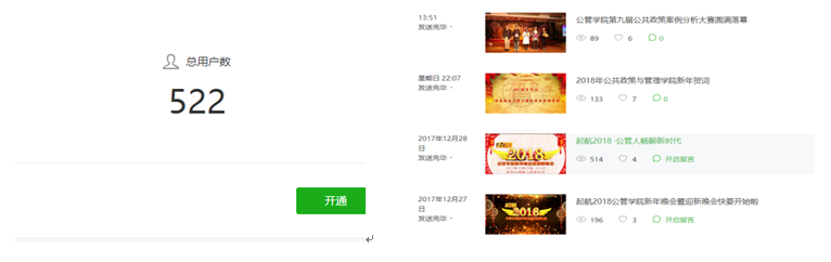 团工委指导研会管理公众号的运行,研会公众号现有关注量为500多人,相比之前增加了5倍,推送内容涵盖了学院新闻、学生活动、讲座报告、招聘就业、节日宣传、学生风采等信息。并且,团工委指导申请并运营学院官方微信公众号“西安交通大学公管学院”,自2017年11月运营以来,宣传效果显著,浏览与转发量近2000余次。