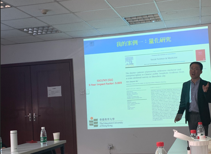 讲座是以座谈的方式进行的。首先,和经纬副教授介绍了自己的相关研究和主编的学术期刊;接着他结合自己发表的学术论文和研究心得,从方法论的角度重点讲述了医疗卫生政策的定量和定性研究方法,深入讲解了质性研究的基本逻辑、数据收集方法、研究价值和政策意义;最后,和经纬副教授与大家探讨了医疗卫生领域中医疗保险制度的碎片化、诱导需求、防御性医疗、道德风险及逆向选择等学术问题。