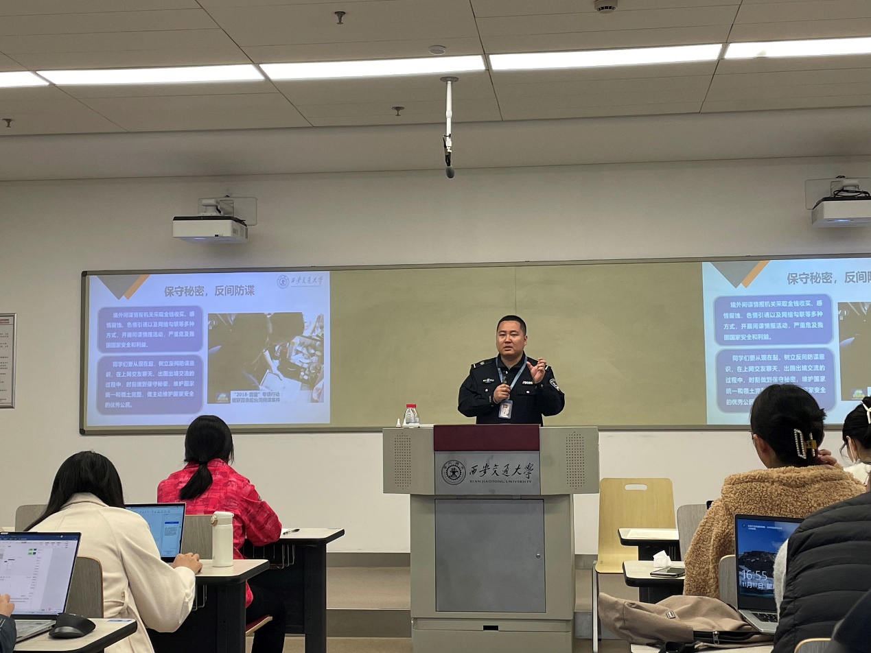 常老师紧接着介绍了关于“反间防谍”的相关内容,他告诫同学们要高度警惕此类事情的发生,树立“反间防谍”意识,在上网交友聊天和出国出境交流的过程中,时刻做到保守秘密,维护国家统一和领土完整。