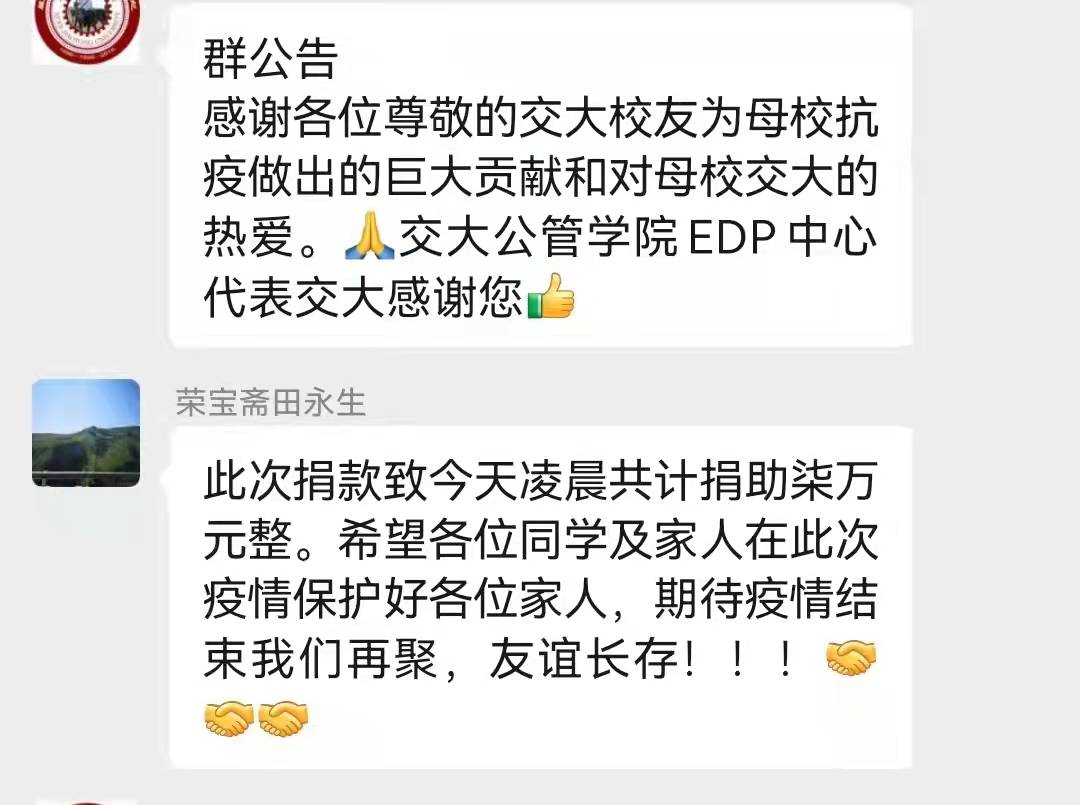 疾风知劲草,烈火见真金。公管学院向每一位为抗击疫情付出艰苦努力、做出贡献的交大人及社会爱心人士致敬!公管学院院友用实际行动强力支援西安疫情防控工作,充分体现了“一方有难八方支援”的互助互爱精神,充分展现了西安交通大学校友企业家服务社会、奉献爱心的政治自觉和家国情怀。让我们用爱心与温暖凝聚起抗击疫情的合力,弘扬饮水思源精神,为迎接战“疫”全面胜利继续贡献卓越的交大智慧和交大力量。