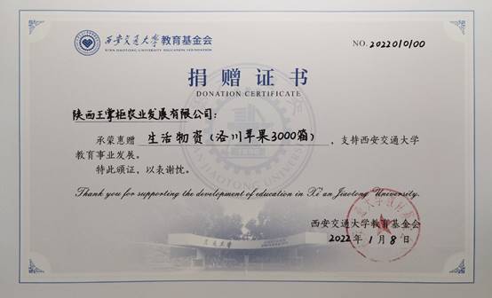 校教育基金会为陕西王掌柜农业发展有限公司颁发的捐赠证书