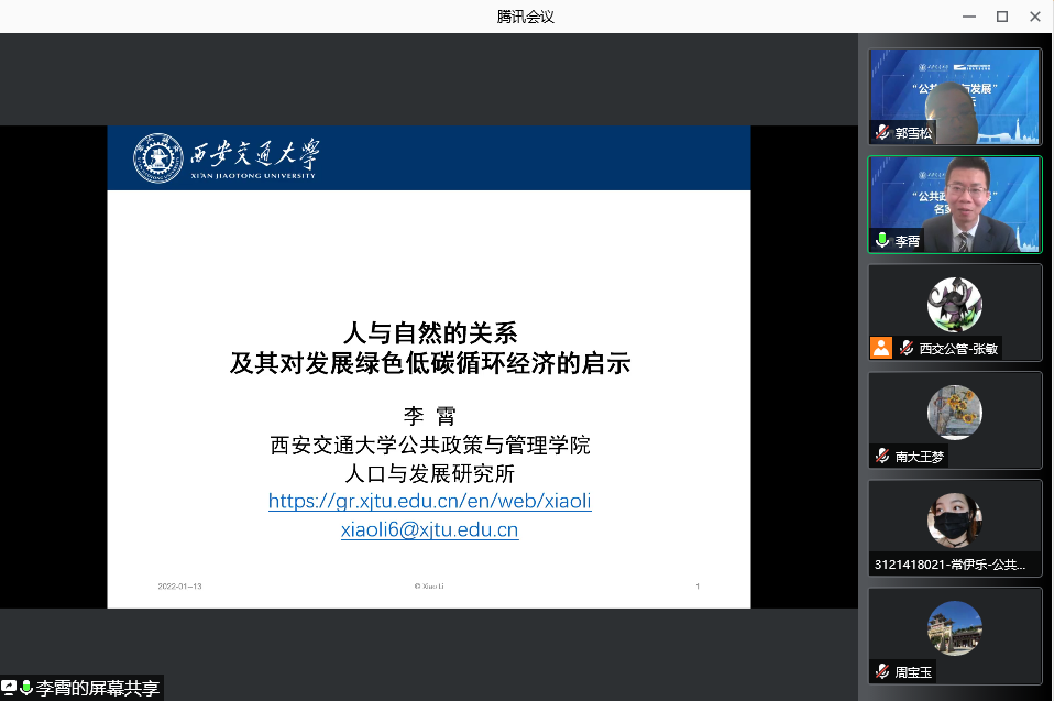2022年1月13日下午,我院在线上组织召开了“公共政策与发展”名家讲坛,邀请我院青年拔尖人才李霄教授做了题为“人与自然的关系及其对发展绿色低碳循环经济的启示”的讲座报告,学院本科生、研究生及校内外师生共计120余人线上聆听了此次报告,本次讲座由学院副院长郭雪松教授主持。