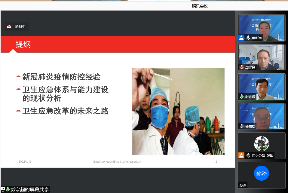 2022年1月15日上午,我院在线上组织召开了“公共政策与发展”名家讲坛,邀请清华大学公共管理学院党委书记彭宗超教授做了题为“新冠疫情防控与卫生应急改革”的讲座报告,学院本科生、研究生及校内外师生共计200余人线上聆听了此次报告,本次讲座由学院党委书记董新宇教授主持。