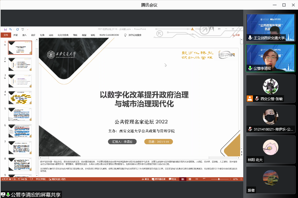 2022年1月18日下午,我院在线上组织召开了“公共政策与发展”名家讲坛,邀请我院青年拔尖人才李清宏副教授做了题为“以数字化改革提升政府治理与城市治理现代化”的讲座报告,学院本科生、研究生及校内外师生共计250余人线上聆听了此次报告,本次讲座由学院副院长王立剑教授主持。