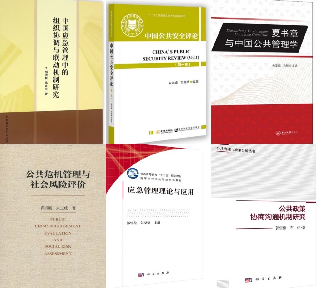 团队已先后主持或参与了多项课程建设、教材与专著出版工作。其中,代表性课程如《公共危机治理》在线课程、《系统工程》国家精品课程、《风险治理前沿问题分析》等。代表性教材如:《中国公共安全评论》(2016年版,朱正威、肖群鹰主编,金城出版社、社会科学文献出版社)、《系统工程简明教程》(2017年第四版,汪应洛主编,高等教育出版社)、《应急管理理论与应用》(2021年版,郭雪松、刘莹莹主编,科学出版社)。代表性专著如:《区域公共安全与应急管理协调联动机制研究——基于陕西省的实证研究》(2017年版,朱正威、郭雪松著,科学出版社)、《中国应急管理中的组织协调与联动机制研究》(2016年版,郭雪松著,中国社会科学出版社)、《公共政策协商沟通机制研究》(2022年版,郭雪松、石佳著,科学出版社)、《公共危机管理与社会风险》(2013年版,肖群鹰、朱正威著,社会科学文献出版社出版)。