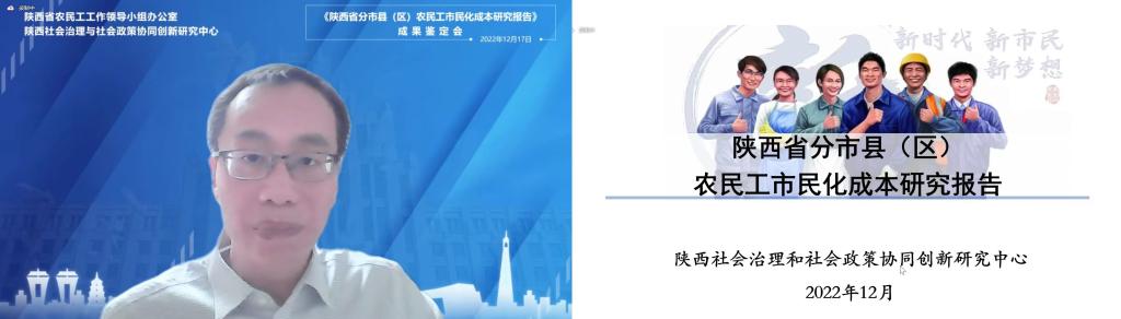 2022年12月17日下午,陕西省农民工工作领导小组办公室和陕西社会治理与社会政策协同创新研究中心线上联合举办《陕西省分市县(区)农民工市民化成本研究报告》成果鉴定会。鉴定会邀请了五位相关领域的知名专家对成果进行鉴定。陕西省决策咨询委员会专家组组长、西北农林科技大学讲座教授石英担任专家组组长。作为专家组成员,中国社会工作联合会副会长、原国家卫生计生委流动人口司司长王谦,中国人口与发展研究中心主任、研究员贺丹,中国人口学会副会长、上海大学教授朱宇,中央民族大学教授杨菊华参加鉴定会。陕西省人力资源和社会保障厅农民工工作处处长刘渤海,陕西省人力资源和社会保障厅农民工工作处副处长吴杨,陕西社会治理与社会政策协同创新研究中心首席专家李树茁教授,中心研究人员、课题组负责人悦中山教授,中心研究人员白萌副教授,毕静煜助理教授,5名博士研究生和4名硕士研究生参加会议。会议由专家组组长石英教授主持。
