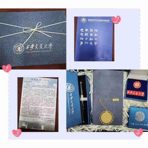 近日,为感谢西安交通大学公管学院校友对我们工作的关怀与支持,学院校友工作组联合学校教育基金会向参加2022年以“寻找校友”为主题的公管学院线上校友信息采集的校友寄出了精美纪念品。篆刻“西安交通大学”字样的校徽、签字笔、笔记本、书签在交大蓝面的绒里盒子中,独特美观;公管学院党委书记、院长和教育基金会会长的签名寄语与这份独一无二的纪念品一起,在校友的朋友圈里充满意外与惊喜地刷屏了。