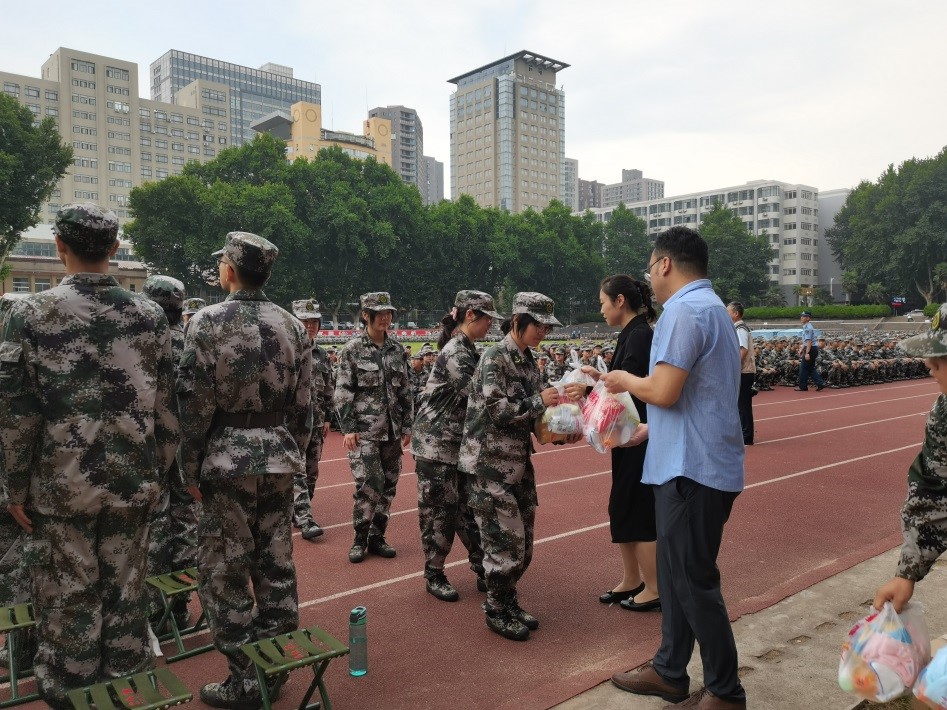 周忠良代表学院全体老师向军训教官、指导员发放慰问品,对他们的辛苦付出表示感谢。学院党政领导及教师为军训同学们发放慰问品,并合影留念。
