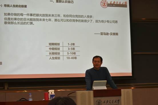 叶向元主要从三个部分为同学们展开指导,分别为:重新认识自己,职业生涯规划,行动路径设计。在第一部分,他首先以北极星为比喻,鼓励同学们以长远的眼光找到属于每个人不同的“人生方向”。同时,结合施恩职业测试和胜任力模型与现场同学进行了深度互动,生动揭示出如何寻找到职场上的“自我”。在第二部分,他提纲挈领式地向同学们介绍了职业生涯发展理论,并从“行业选择”“城市选择”“企业性质”“企业组织结构”“岗位类型”“是否创业”六个维度对职业生涯的“作用、影响、重要性、如何去选择?”逐一展开了详尽的分析与讲解,为同学们拨云见日、去除疑问。在第三部分,围绕“行动路径设计”这个问题,建议同学们自身在做职业规划时首先要“快速了解一个行业、快速了解一个企业、深入拆解一类岗位”,提高自己对职业内涵的认知。其次,要不断更新自己的认知,坚持不断学习。最后,要多读优秀企业和人物传记。只有这样,才能基于我们自己的认知与需求,设计出具有每个人专属的职业发展路径。