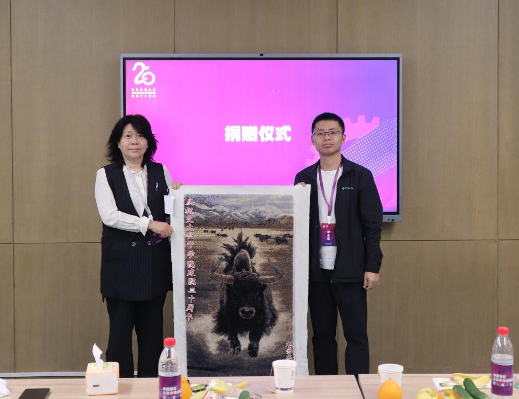 就职于中国农业发展银行的赵永亮校友捐赠印有“牦牛”图案的藏毯,赵永亮介绍牦牛所代表的“坚韧、憨厚、忍耐”精神,与校训和西迁精神相契合,祝福学院能够像牦牛一样奋蹄疾驰、行稳致远。