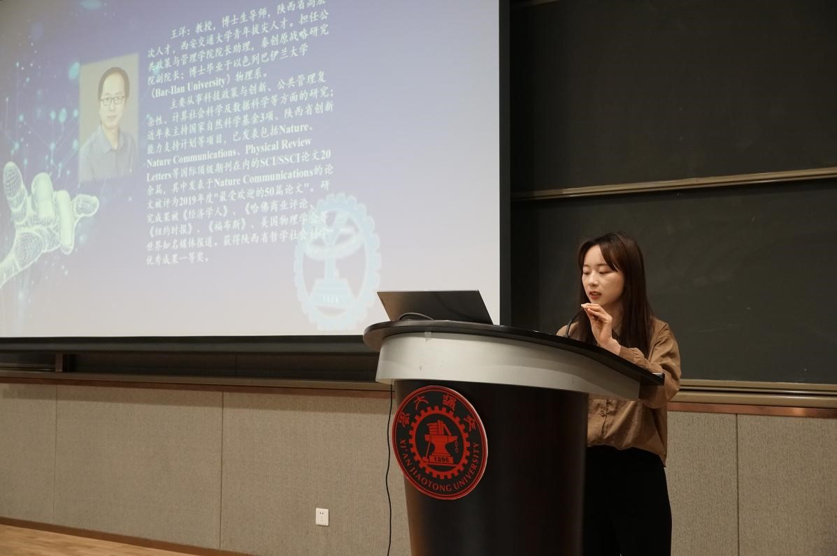 活动开始,主持人曹欣雨介绍了王洋教授的学术经历和研究成果。王洋教授被评为陕西省高层次人才、西安交通大学青年拔尖人才。现担任公共政策与管理学院院长助理,秦创原战略研究院副院长。主要从事科技政策与创新、公共管理复杂性、计算社会科学及数据科学等方面的研究。主持/参与国家自然科学基金、美国空军实验室、欧盟玛丽居里等多项科研项目;近年来发表SCI/SSCI论文十余篇,其中发表于Nature Communications的论文被评为2019年度“最受欢迎的50篇论文”。