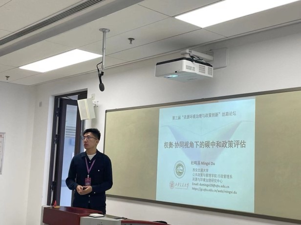 随后,西安交通大学公共政策与管理学院建院二十周年、人口与发展研究所建所四十周年系列学术活动之一第三届“资源环境治理与政策创新”丝路论坛正式拉开帷幕。本次论坛共设置4个分论坛,每个分论坛分别有4位专家作报告。分论坛一由西安交通大学公共政策与管理学院教授、资源与环境治理研究中心研究员杨东朗主持。南京大学环境学院教授、环境规划与管理系副主任刘蓓蓓作了题为《农业气候适应和环境可持续性的治理研究》的报告;西安交通大学公共政策与管理学院教授、资源与环境治理研究中心副主任刘哲作了题为《从循环经济领域研究到绿色治理研究的若干思考》的报告;清华大学地球系统科学系特别研究员同丹作了题为《气候与环境协同治理的增效新机制》的报告;西安交通大学公共政策与管理学院教授、资源与环境治理研究中心研究员杜鸣溪作了题为《权衡—协同视角下的碳中和政策评估》的报告。