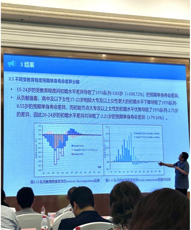 姜全保教授以“中国女性未婚比例和预期单身寿命的变化——基于时期和队列初婚表的分析”为题进行了主旨报告,该研究采用1990年、2000年、2010年和2020年人口普查资料及2017年全国生育状况抽样调查数据,通过构建时期和队列粗初婚表探讨了女性初婚水平的变化趋势,得出了时期和队列间女性初婚概率、未婚比例和预期单身寿命在城乡户籍和不同受教育程度间的差异。