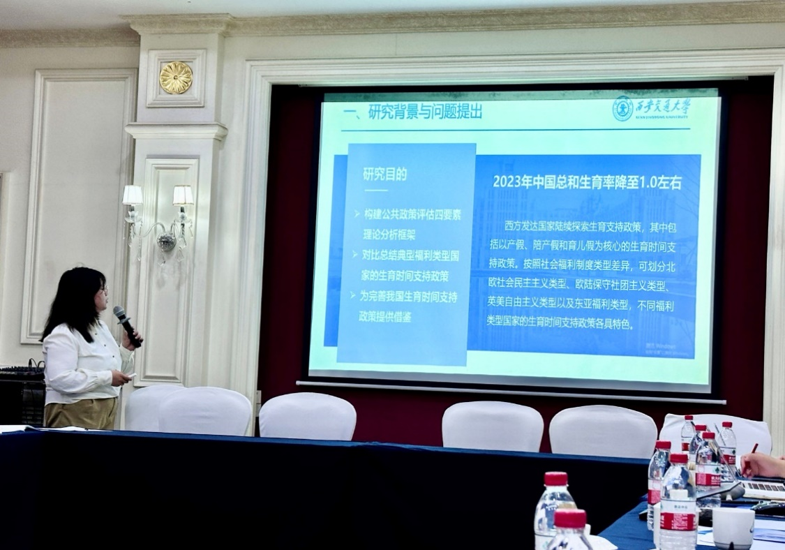 硕士生唐玲在分论坛“家庭结构、生育政策与生育意愿”进行了题为“国际视野中的生育时间支持政策:比较与借鉴”的口头汇报,该研究根据社会福利制度类型的划分,采用瑞典、丹麦、德国、意大利、英国、美国、日本、韩国和中国关于生育支持政策的二手数据,基于四要素的公共政策评估分析框架对不同福利类型国家的生育时间支持政策进行对比和分析。研究发现,目前中国在生育时间支持方面存在的主要问题是政策理念未能反映社会实际需求、休假时长不合理、企业和家庭承担较多休假成本。建议提倡“普惠性”和“双职工模式”的政策理念、合理设置休假时长,平衡家庭生育分工、完善生育休假成本分担机制,减少家庭和企业生育负担。与会学者围绕文章内容进行充分的交流与讨论,并为研究的进一步开展提出富有建设性的意见与建议。