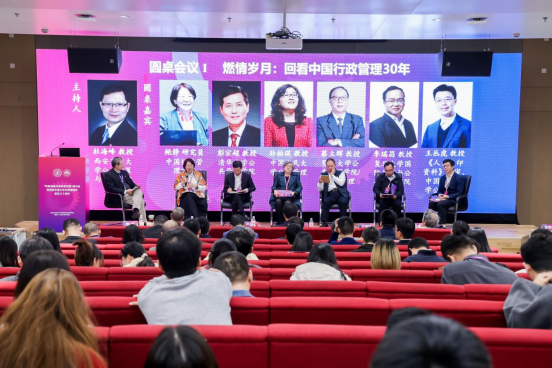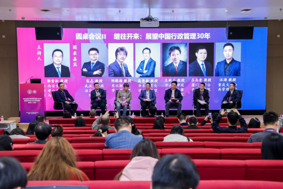 第三环节为圆桌会议。共设置了两个议题,第一场圆桌会议的主题是《燃情岁月:回看中国行政管理30年》,邀请到中国行政管理学会鲍静研究员、清华大学公共管理学院彭宗超教授、中国人民大学公共管理学院孙柏瑛教授、暨南大学公共管理学院及应急管理学院蔡立辉教授、复旦大学国际关系与公共事务学院李瑞昌教授、《人大复印资料》编审及中国人民大学公共管理学院王丛虎教授作为嘉宾发言,西安交通大学公共政策与管理学院杜海峰教授作为主持人。