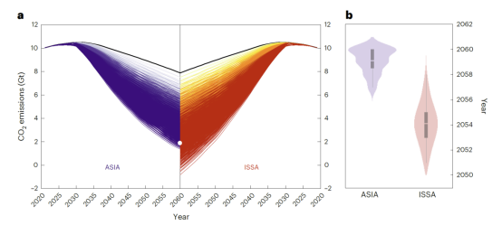 未来我国实现碳中和对于全球《巴黎协定》1.5°C目标的达成具有重要意义。实现碳中和目标依赖于多种减排政策的共同实施。但需要注意的是,政策间的权衡与协同会影响到最终实施效果。为了回答减排政策关联如何影响碳中和目标的实现这一科学问题,该研究构建了1295种减排政策的组合情景,基于动态可计算一般均衡模型对于减排效果和经济成本进行了模拟与分析。所有的组合情景都分别在两种假设下进行模拟和比较:考虑政策关联(ASIA)和不考虑政策关联(ISISA)。结果表明(下图),减排政策间的关联效果会使实现碳中和的难度上升接近六倍,使实现碳中和的平均年份推迟接近六年。在所有的减排政策中,无论是减排效果还是经济成本,碳定价和可再生能源政策之间都产生了最强的权衡效应,而可再生能源和终端电气化政策之间存在最强的协同效应。这一现象的原因可总结为:当具有互补机制/竞争机制的减排政策共同实施时,会扩大/压缩其潜在的政策空间,从而产生协同效应/权衡效应。因此对于我国及处于能源转型期的广大发展中国家来说,优先保障可再生能源与终端电气化的共同发展会是最为有效的减排政策组合。该研究揭示了政策关联对于政策效果的显著影响与作用机制,强调了通过优化政策组合与定序从而提升政策效率的重要性与可行性。