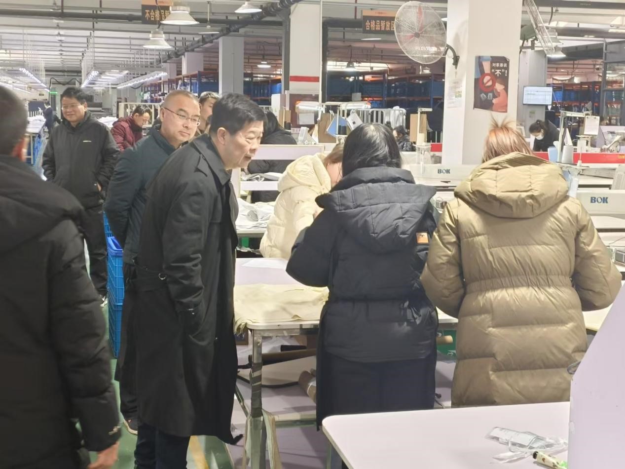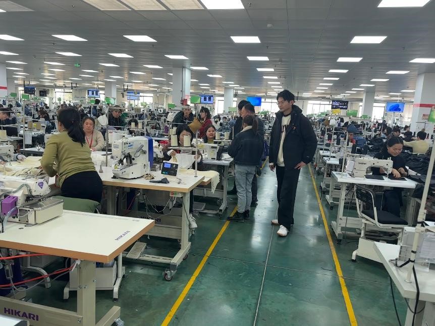 1月14日下午,在陕西省白水县的陕西雁中制衣有限公司和耐克阿迪等知名品牌的代工厂,调研队在缝纫机此起彼伏的哒哒声中来回穿梭,成捆的布料齐齐地码在一旁,在工人们灵巧的双手下变身款式新颖、剪裁合身的衣物。干净整洁的生产车间里工人们井然有序,又因师生们的到来而掀起一阵欢快的涟漪。紧接着,团队赶往由白水县人社部门牵头搭建的零工市场开展座谈会,了解当地企业招工和民工就业的详细信息。这也让同学们了解到当地政府大力的就业扶持政策与宝贵经验。