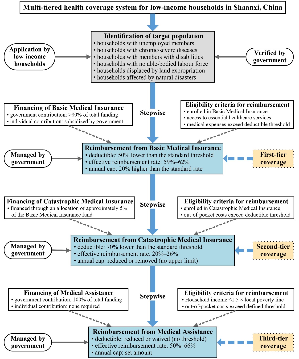 Figure 1. Structure and operational features of the multi-tiered health coverage system for low-income households in Shaanxi Province, China. The diagram illustrates the institutional framework and operational flow of China’s multi-tiered health coverage system for low-income households, comprising basic medical insurance (BMI), catastrophic medical insurance (CMI), and medical assistance (MA). Coverage proceeds in a stepwise manner, with each tier activated upon meeting defined eligibility criteria and reimbursement thresholds. Each scheme operates under its own set of rules—including deductibles, reimbursement rates, and annual caps. Shaded blue boxes represent the components evaluated in this study, based on administrative data from 2013 to 2016. Effective reimbursement rates reflect the actual reimbursement received as a percentage of total medical expenses, rather than the nominal policy rates.