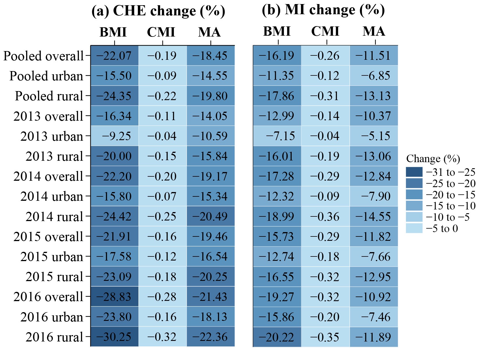 Figure 2. Percentage-point changes in CHE incidence after reimbursement through China’s multi-tiered health coverage system. Heatmaps display changes in the incidence of (a) catastrophic health expenditure (CHE; 25% threshold) and (b) medical impoverishment (MI; USD 1.90 threshold), after reimbursements from basic medical insurance (BMI), catastrophic medical insurance (CMI), and medical assistance (MA). Results are shown for pooled and annual subgroups stratified by urban–rural status. All changes are negative. Darker shades indicate larger reductions in incidence. Full numerical results are reported in supplemental appendix table A5.