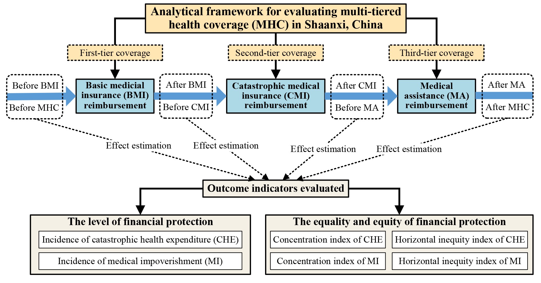Appendix figure A2. Analytical framework for evaluating multi-tiered health coverage (MHC) in Shaanxi, China. MHC: multi-tiered health coverage; BMI: Basic Medical Insurance; CMI: Catastrophic Medical Insurance; MA: Medical Assistance; CHE: catastrophic health expenditure; MI: medical impoverishment.
