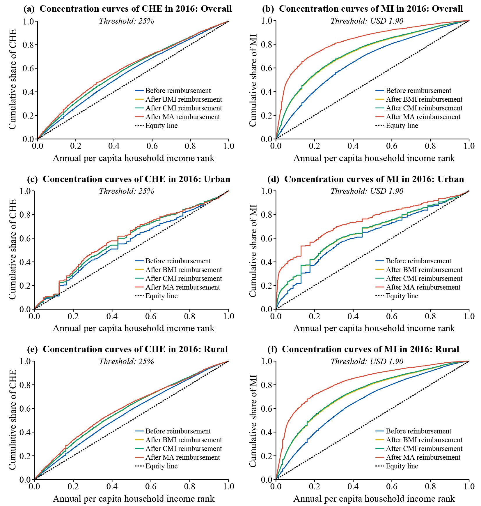 Appendix figure A7. Concentration curves of catastrophic health expenditure (CHE) and medical impoverishment (MI) in 2016: overall and by urban–rural residence.