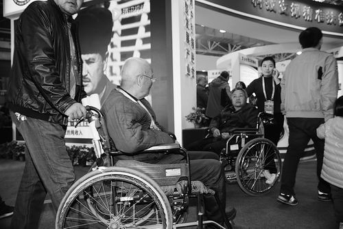 坐轮椅逛农高会的老年人——有质量的养老保障