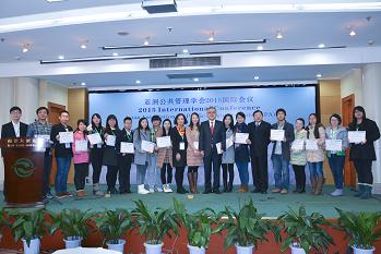 在会上,先后有九位国内外著名公共管理学者和专家做了精彩的主题报告。其中,复旦管理学奖(国内管理学最高奖)得主薛澜教授、李树茁教授分别从全球化治理和性别失衡治理的角度探讨了公共行政和公共政策研究的前沿问题,会议执行主席吴建南教授从全球化的视角分析了政府和市场如何影响公众幸福感,他们在十八届三中全会提出“加快推进国家治理体系和治理能力现代化”的时代背景下共同诠释了中国公共管理学者对国家发展和人民福祉的关切。国际行政科学评论(IRAS)杂志主编英国Exeter大学Andrew Massey教授、日本全球化领导与国家政策研究院行政发展中心Masahiro Horie教授、香港城市大学Richard Walker教授、泰国行政管理学会主席朱拉隆功大学Supachai Yavaprabhas教授、印度尼西亚行政管理学会前主席印尼大学Eko Prosojo教授分别从各自研究领域阐述了充满启发性的学术观点,国家交通运输物流公共信息平台作为公共管理实践部门介绍了其在现实中的创新经验,引发了与会者的热烈讨论和称赞。分论坛中,各国学者就改革、创新与可持续发展的本土化经验展开了详实的论证和讨论,西安交通大学公共政策与管理学院的十余位师生也做了精彩的报告。大会设置“优秀论文奖”,分别由来自中国、韩国、日本、泰国的四位代表摘得,我校公管学院郭雪松副教授作为中国唯一获奖代表获此殊荣。