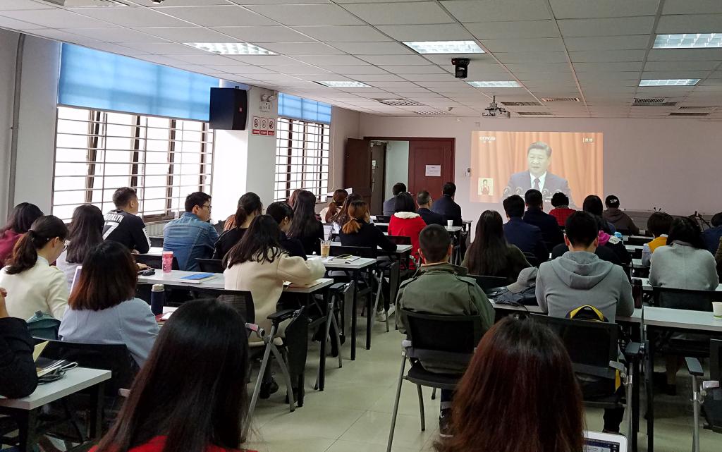 中国共产党第十九次全国代表大会开幕会于10月18日上午9时在人民大会堂举行,习近平总书记代表第十八届中央委员会向大会作报告。公管学院师生党员在公管学院教学实验中心会议室和学院668报告厅两个会场观看了大会开幕会直播盛况,认真聆听了习总书记题为《不忘初心,牢记使命,高举中国特色社会主义伟大旗帜,决胜全面建成小康社会,夺取新时代中国特色社会主义伟大胜利,为实现中华民族伟大复兴的中国梦不懈奋斗》的报告,深刻学习领会习近平总书记报告精神。人力资源部综合办主任翟娜同志与学院党政领导、师生党员共同观看直播。在观看过程中,师生党员们体会深刻、感受颇多。