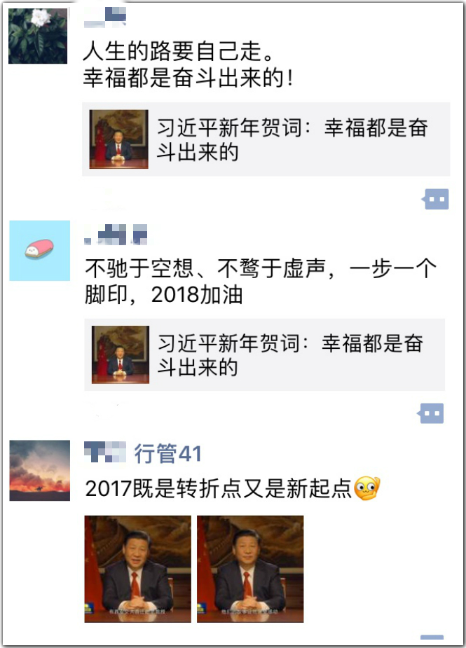 公管学院博2017级班长车蕾:习总书记的新年贺词简短却蕴含着大力量,新的中国,正在幼有所育、学有所教、劳有所得、病有所医、老有所养、住有所居、弱有所扶上不断取得新进展,作为一名新党员在2018年会继续艰苦奋斗、脚踏实地努力为国家、社会、学校做出更大贡献。