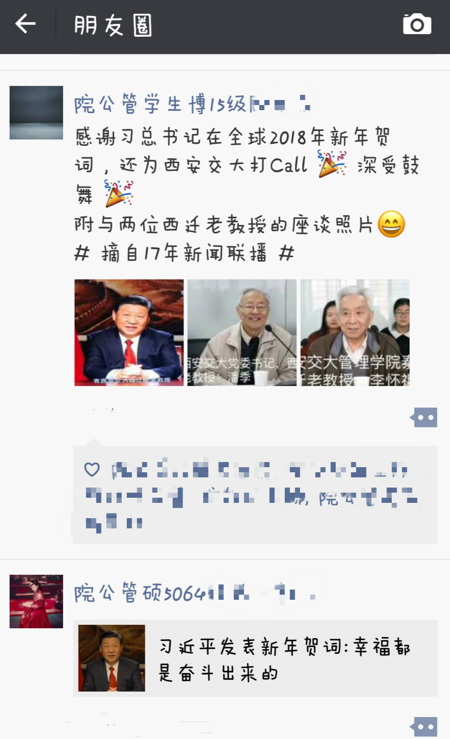 新年前夕,习总书记发表2018新年贺词,其中提到“2017年我又收到很多群众来信,…有西安交大的西迁老教授,…他们的故事让我深受感动。广大人民群众坚持爱国奉献,无怨无悔,让我感到千千万万普通人最伟大,同时让我感到幸福都是奋斗出来的”。新年贺词发表之后,公管学院师生密切关注、热烈讨论。