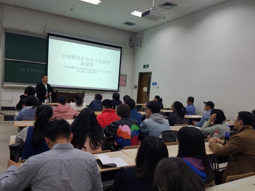 为深入贯彻落实党的十九大精神、全国高校思想政治工作会议精神,增强政治意识、大局意识、核心意识、看齐意识,努力提高政策理论水平,公管学院党委于4月11日下午组织专家宣讲,邀请马克思主义学院王宏波教授关于习近平新时代中国特色社会主义思想进行了深入解读,公管学院师生党员参加了此次学习,由分党委书记薛宇红主持。