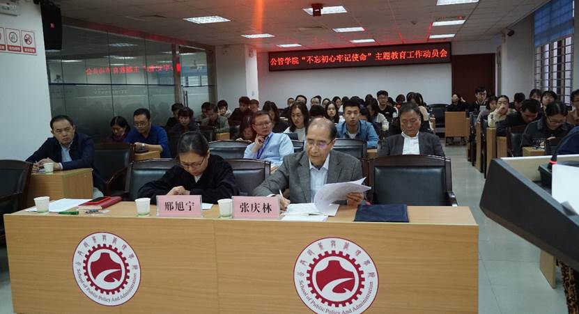 2019年9月19日下午,公管学院在学院教学实验中心报告厅召开“不忘初心牢记使命”主题教育工作动员会。公管学院分党委党政领导班子成员、学术带头人、系所负责人、党支部书记及师生党员代表参加会议,同时校第八指导组组长张庆林同志,刑旭宁同志出席会议。会议由副书记王立剑主持。