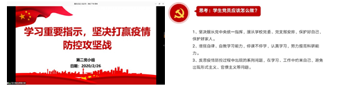 2020年2月26日晚上七点。公管学院硕2019党支部以“坚决打赢疫情攻坚战,发挥党支部战斗堡垒作用”在腾讯会议上召开了本月党组织生活会,由第二党小组带领大家学习习近平总书记关于坚决打赢疫情防控攻坚战的重要指示,第三党小组分享了在此次战疫中勇往直前的党员先锋模范事迹,王立剑副书记参与本次组织生活会并进行了总结讲话。