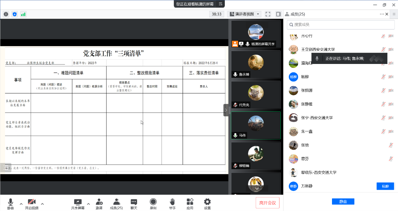 2022年5月25日,社保师生联合党支部召开“聚合力、破难题”专题组织生活会。会议由支部书记杨潇同志主持,全体党员和入党积极分子参加。受疫情影响,本次支部会议采取线上形式召开。