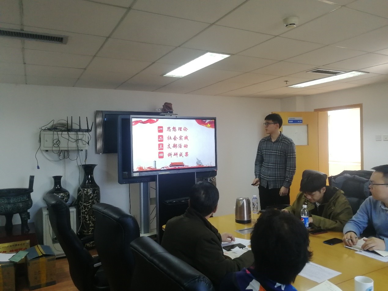 为了公开、透明的做好入党积极分子的培养、考察和发展工作,支部组织入党积极分子进行思想政治和工作汇报,并由全体党员进行打分,以作为发展入党积极分子的参考依据。刘嫄、齐心竹、胡毓群、柳锦楠、朱一鑫等五名入党积极分子分别从思想觉悟、支部活动、社会实践、科研成绩四个方面向组织汇报了自己作为入党积极分子以来的思想、工作等情况。