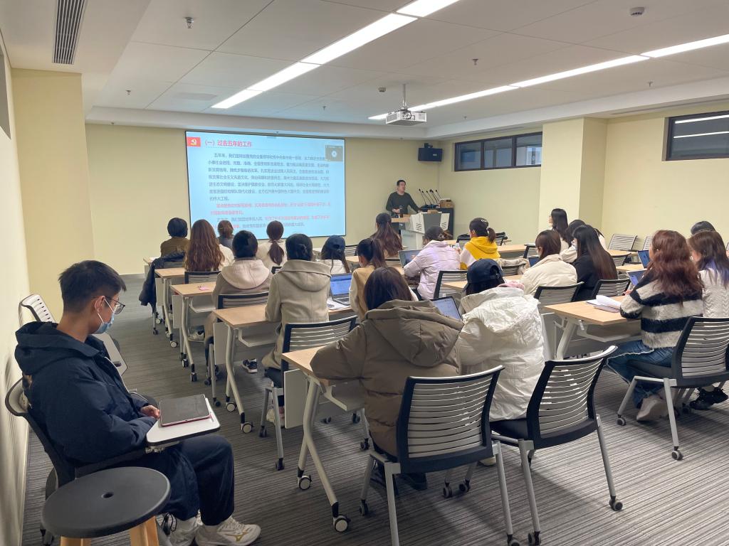 首先,党委副书记杜巍老师围绕“党的二十大”为党员同志上了一堂深刻、生动的党课。杜老师以会议内容为线索,详细介绍了会议主题、“三个务必、” “过去五年的工作和新时代十年的伟大变革”、“开辟马克思主义中国化时代化新境界”、“新时代新征程中国共产党的使命任务”等内容。其中,在提到过去五年的工作中,杜巍老师结合个人经历,生动、有趣、极具感染力地介绍了党和国家应对新冠疫情、实现香港局势由乱到治、反对“台独”分裂和外部干涉、应对国际局势急剧变化等方面取得的重大成就,并表示我们当代人身处百年未有之大变局中,世界之变、时代之变、历史之变的特征更加明显,应当抓住机遇,顶住压力,有所作为,在变局中寻找突破口。最后,杜巍老师嘱托党员同志应当积极学习、分析和利用好党的二十大报告,做研究时要紧扣国家重要发展战略,解国家之难,民生之痛。