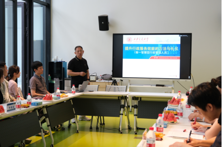 此次共建活动邀请公管学院副教授胡书孝为支部成员开展提升工作效率的方法及礼仪知识专项培训。胡教授的讲解生动形象、幽默风趣,他系统梳理了工作效率的概念、影响因素、目标要求和工作目标,巧妙地展示了在工作中有效沟通、提高工作效率的种种方法,最后组织现场党员开展了游戏互动,让党员们在游戏中深刻体会行政人员需要具备的承上启下、左右协调、内外兼顾、积极进取等品质。